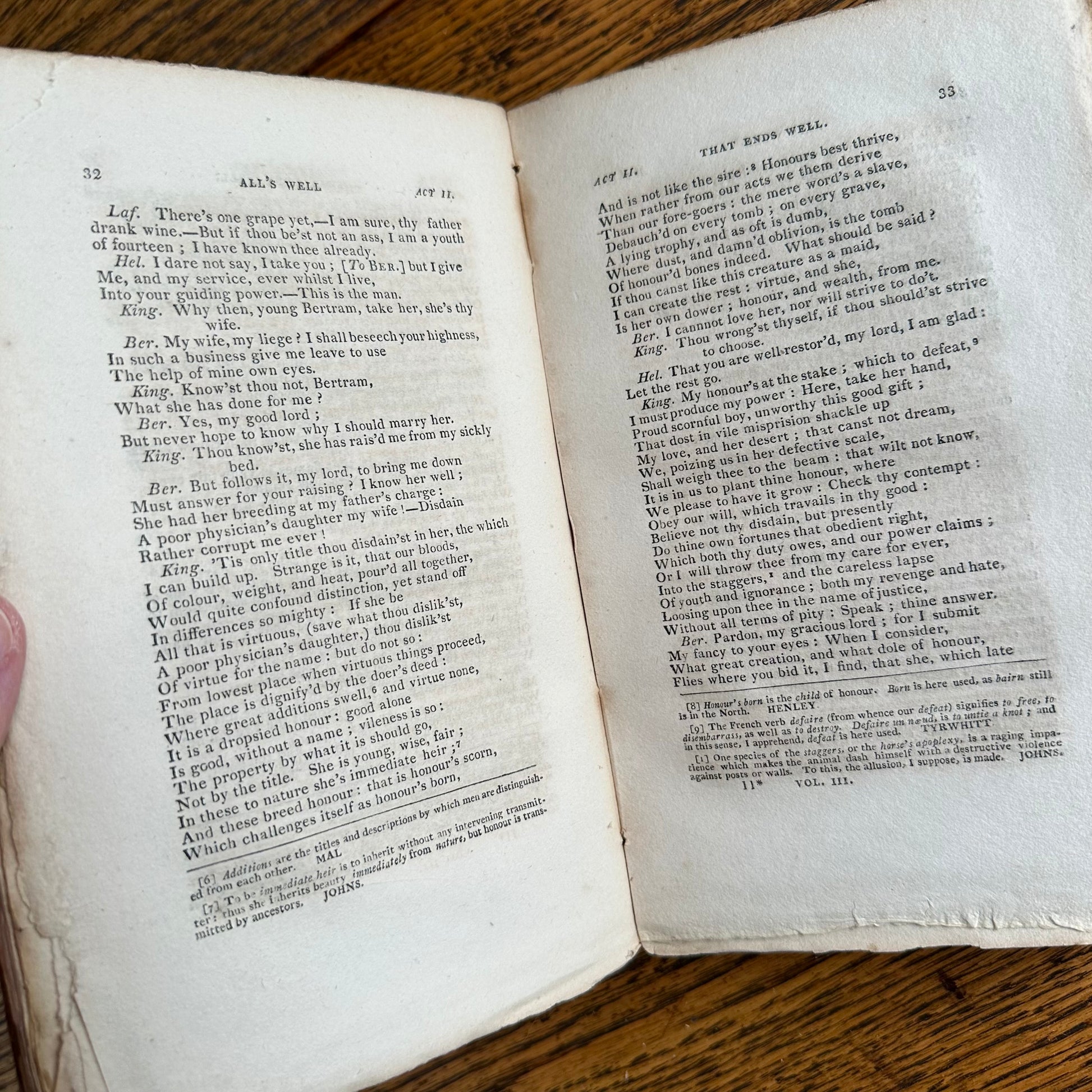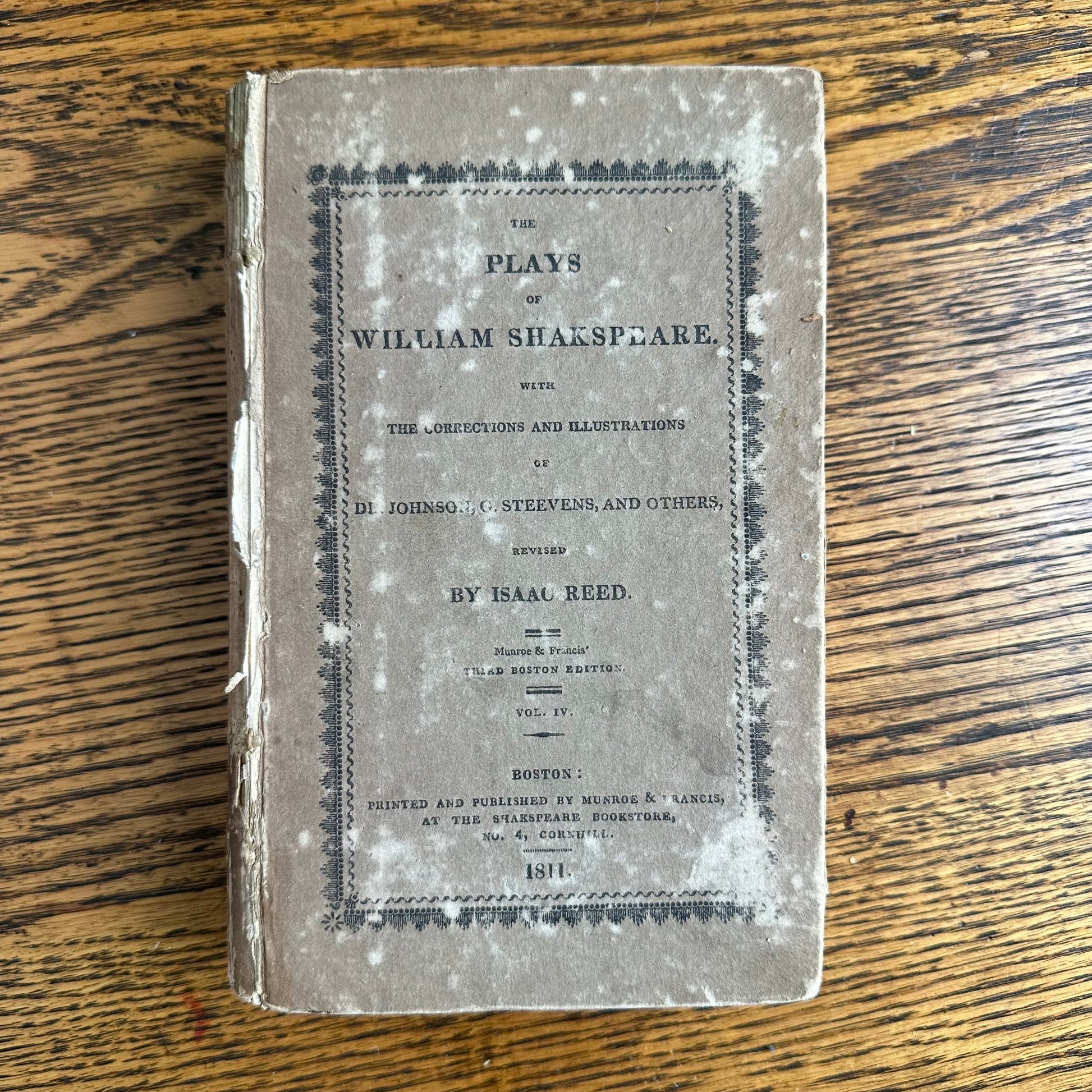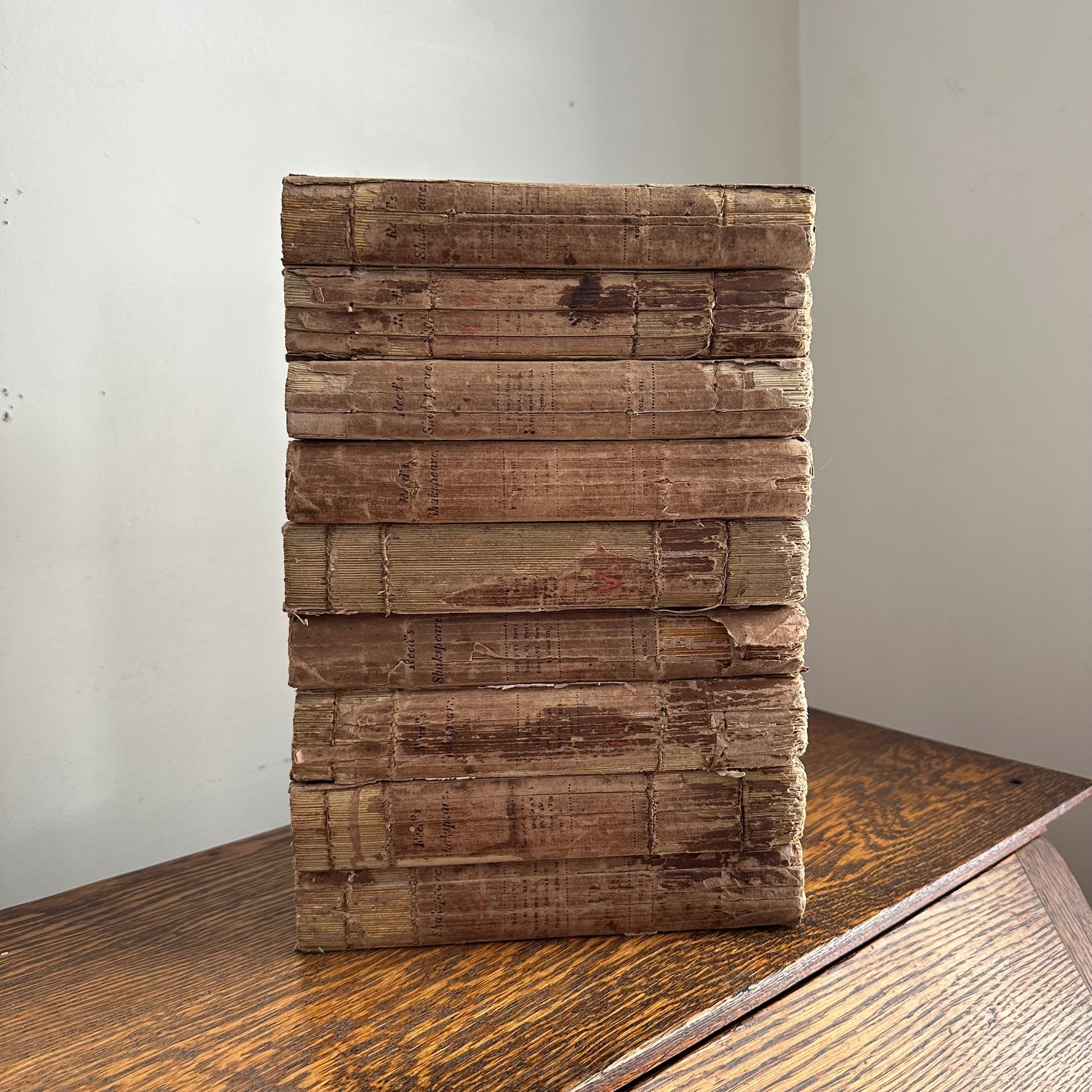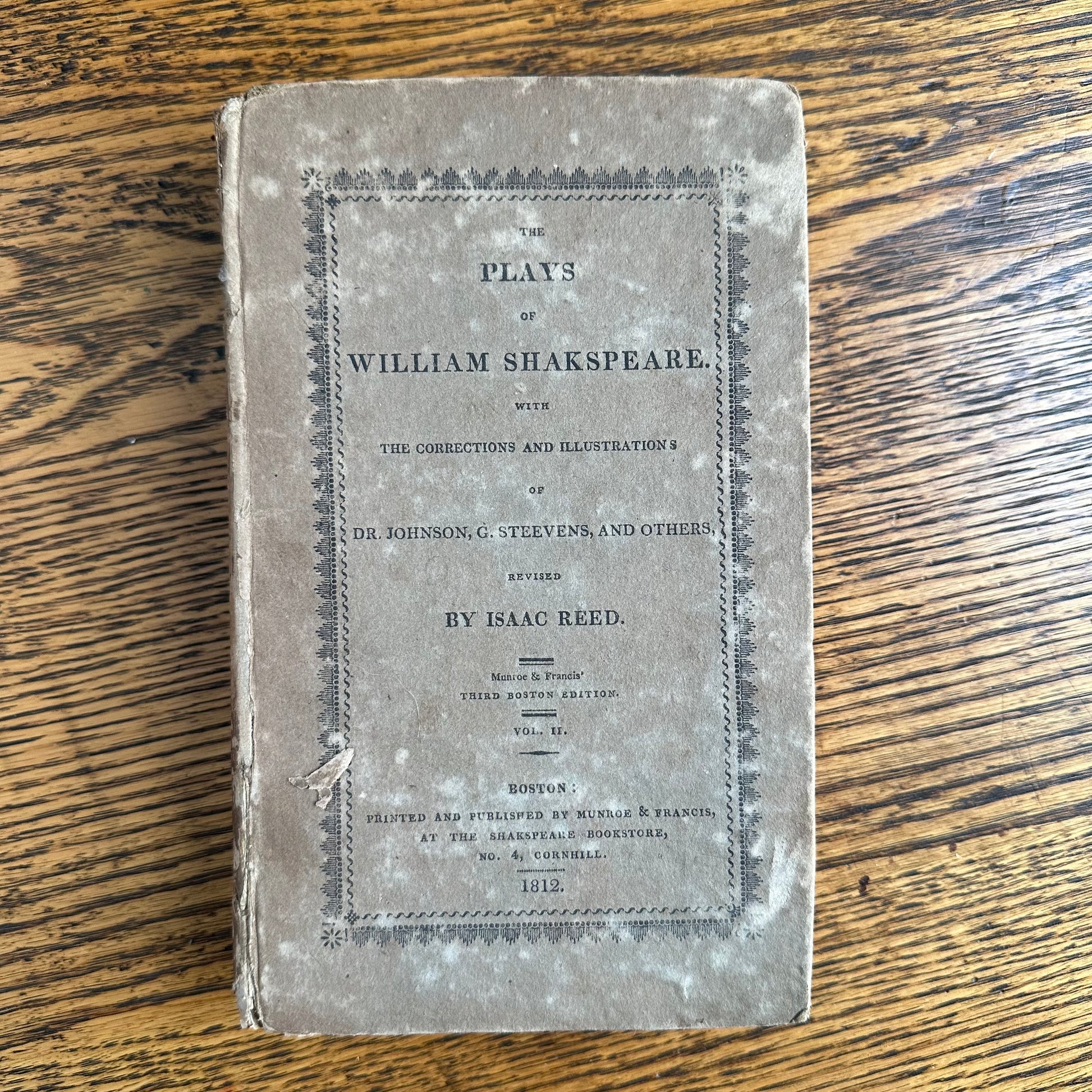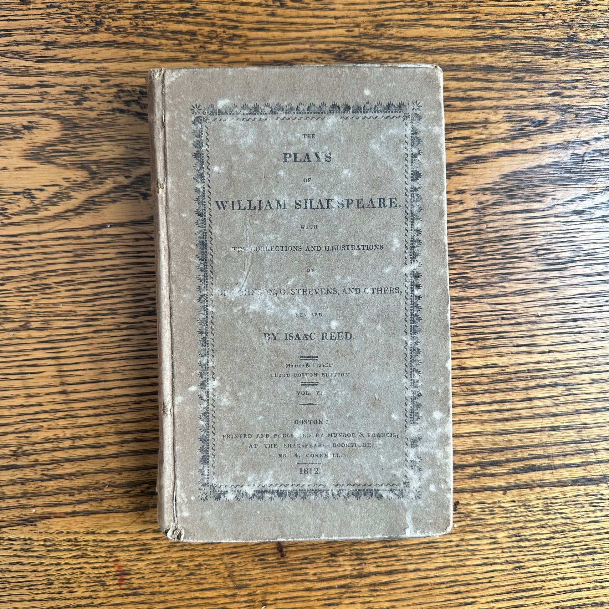 This is the complete set of nine volumes of The Plays of William Shakspeare. The spelling of “Shakspeare” reflects the inconsistent spelling practices of the time. The nine volumes were published between 1810 and 1812 by Monroe & Francis of Boston. In 1834, the set belonged to Henry Williams Jr. of Harvard College. Each volume contains minimal etchings. This set is in very delicate condition as it is over 210 years old. The books are missing parts of their spines, pages are stained with age, and sections of some volumes have separated from the binding. I used the books as decor for several years. The books measure 4.75” x 7.75” and contain approximately 500 pages each.