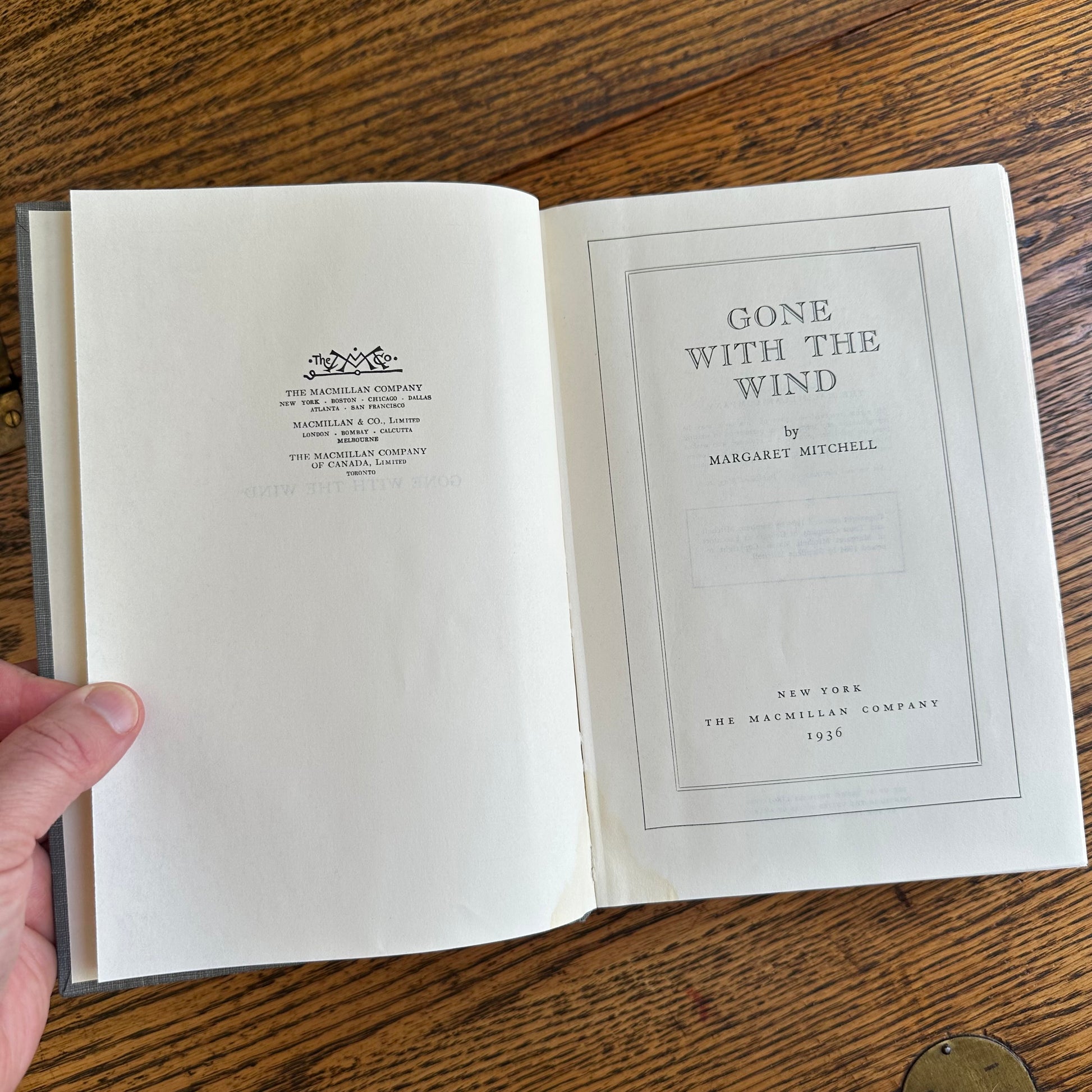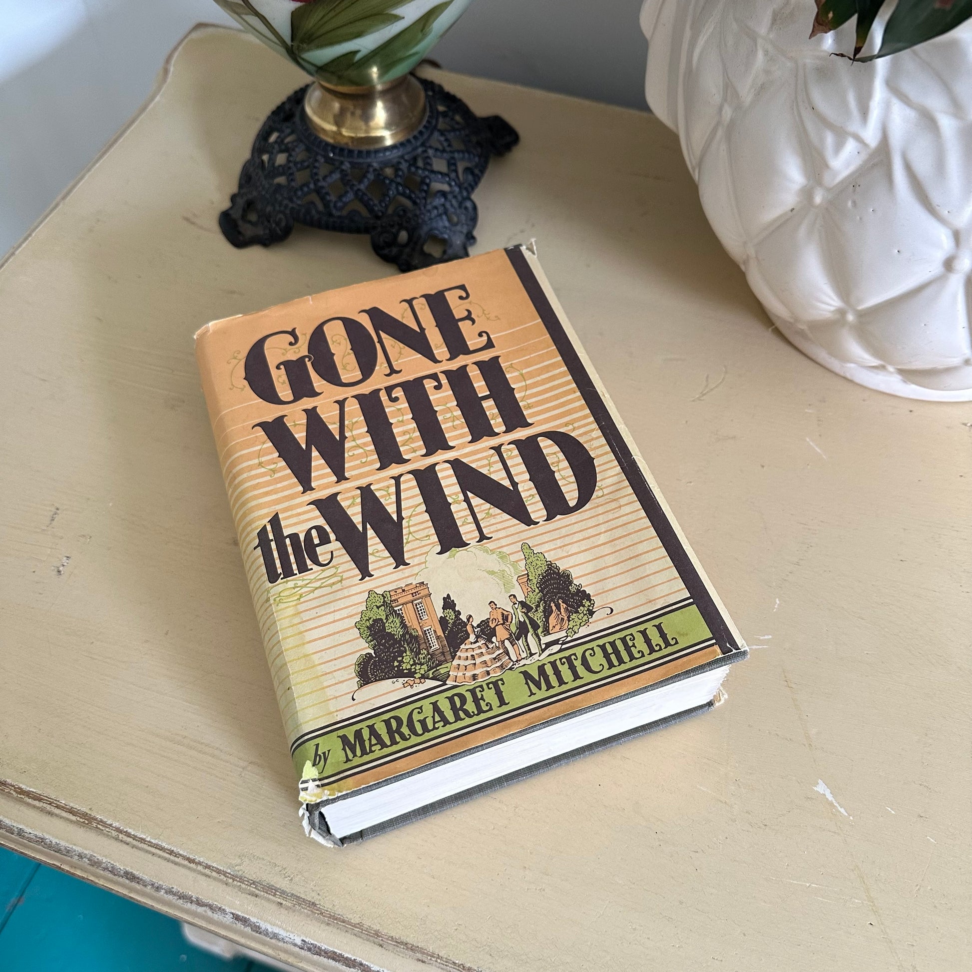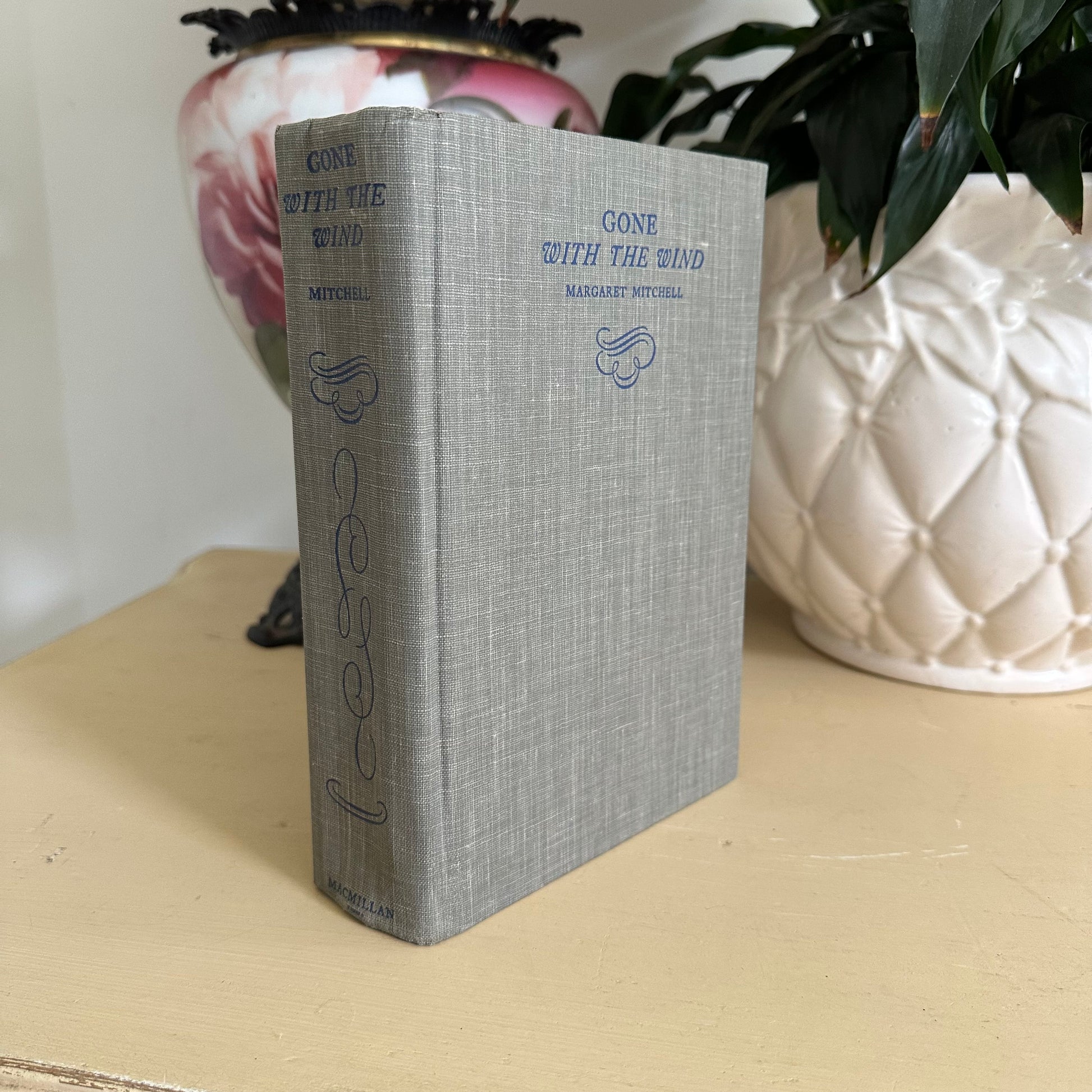 A hardcover 30th Anniversary copy of Gone with the Wind by Margaret Mitchell. This edition was published in 1986 by The Macmillan Co. in New York. The dust jacket shows wear and a light water stain. The book appears never to have been read. It has a very slight water stain at the bottom of the first few pages, but the cover and all other pages are in excellent, like-new condition. This book measures 6” x 8.5” and contains 1,037 pages.