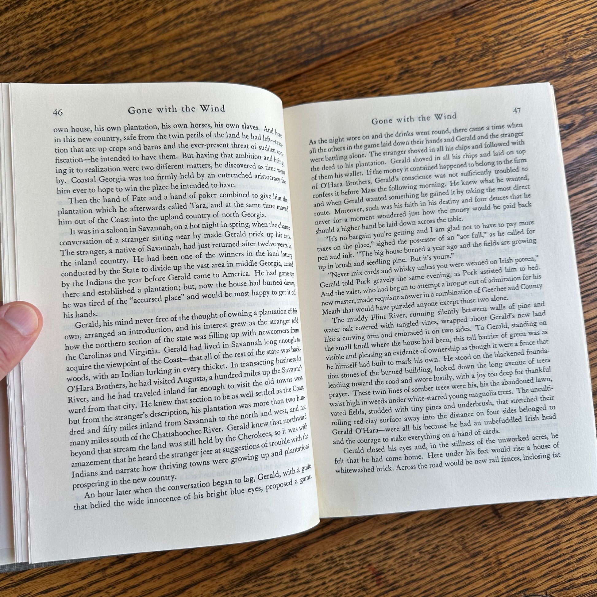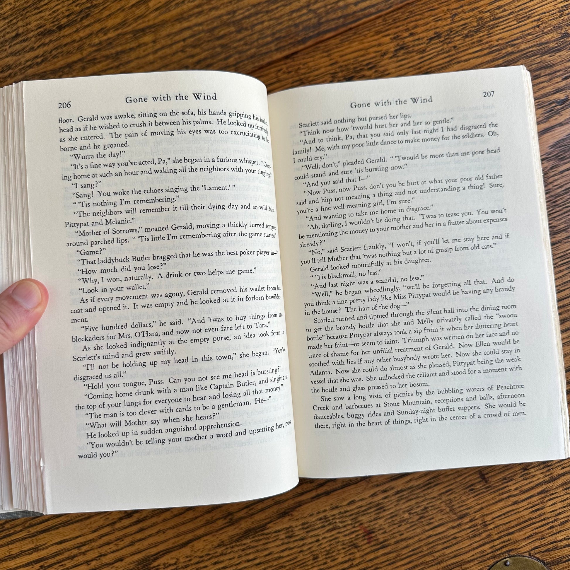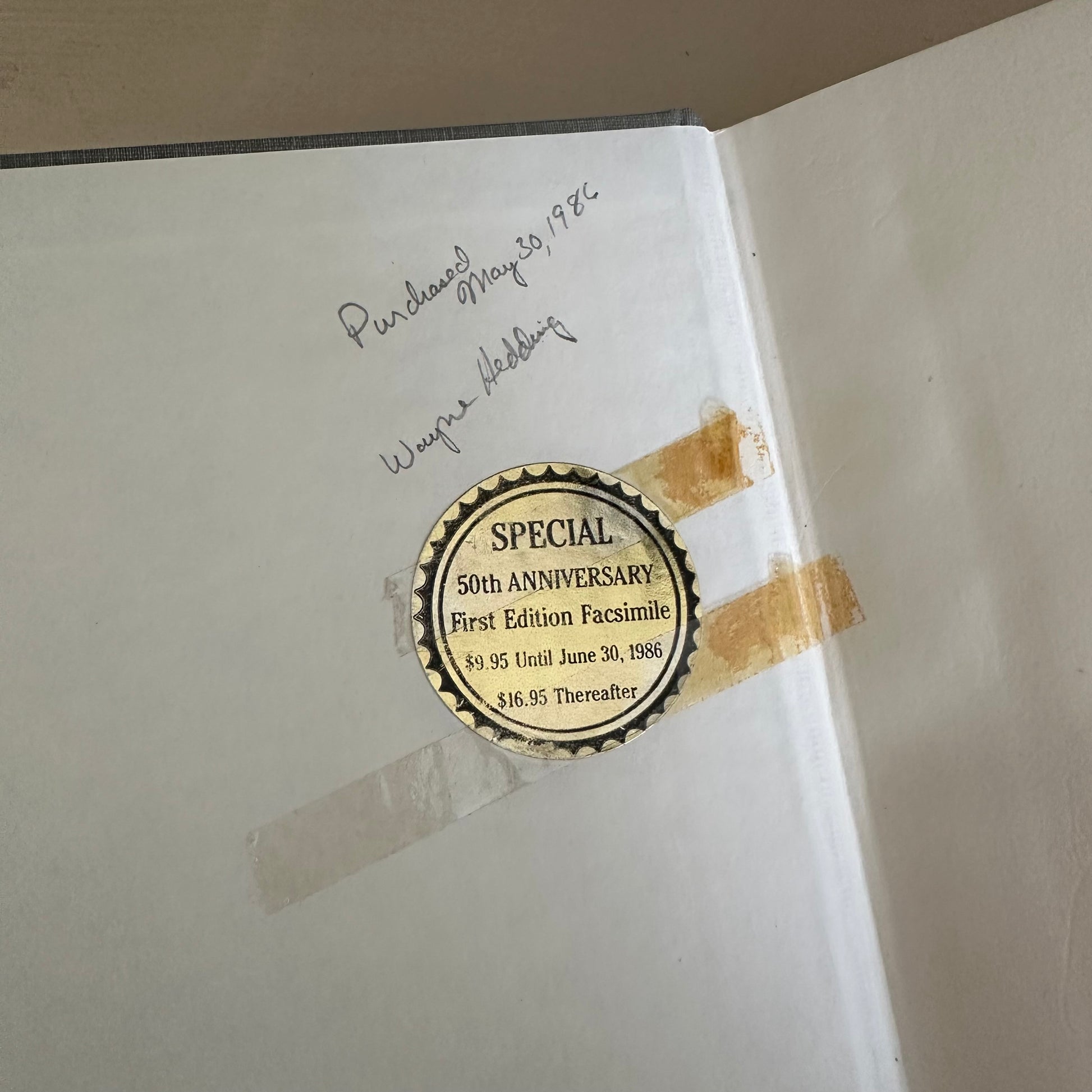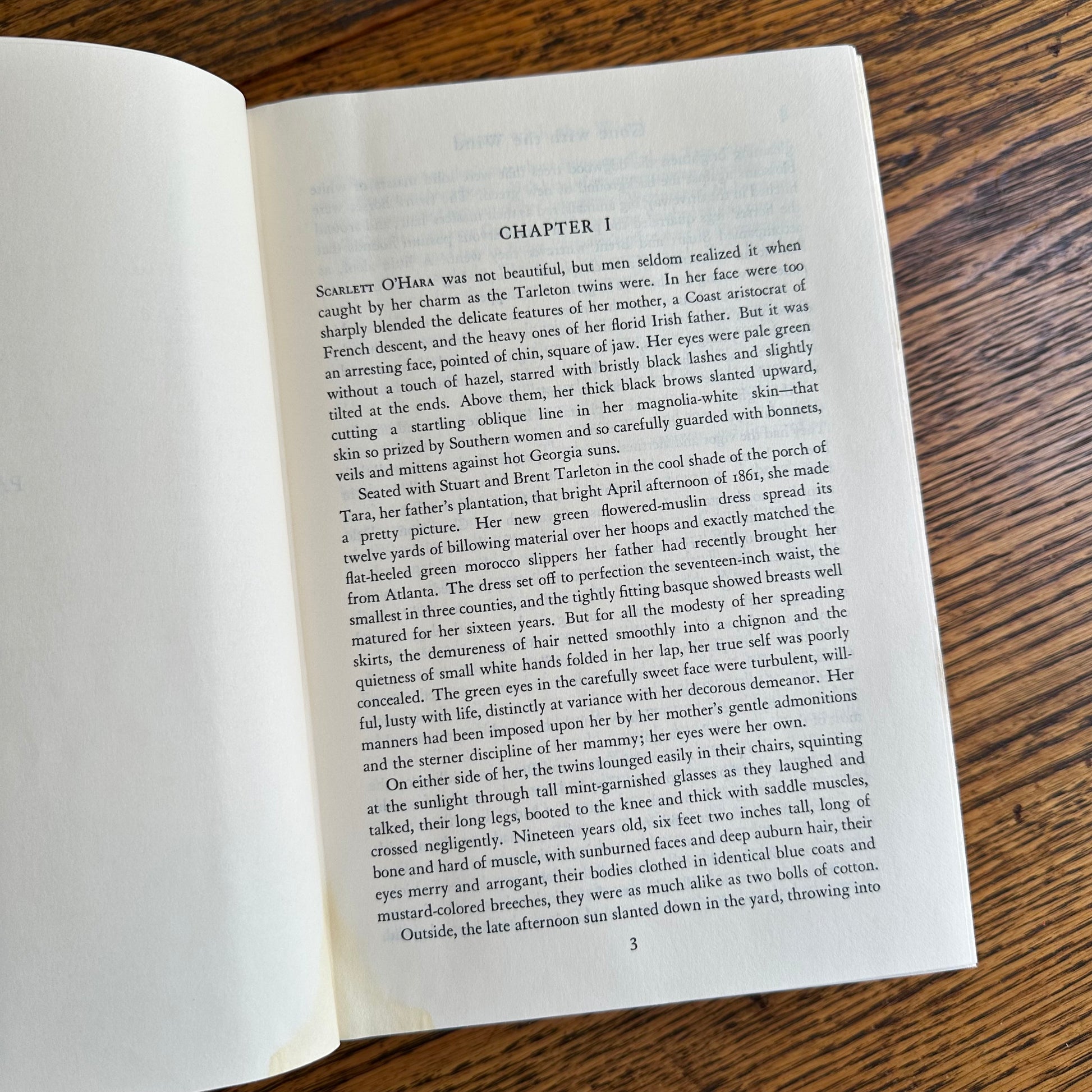 A hardcover 30th Anniversary copy of Gone with the Wind by Margaret Mitchell. This edition was published in 1986 by The Macmillan Co. in New York. The dust jacket shows wear and a light water stain. The book appears never to have been read. It has a very slight water stain at the bottom of the first few pages, but the cover and all other pages are in excellent, like-new condition. This book measures 6” x 8.5” and contains 1,037 pages.