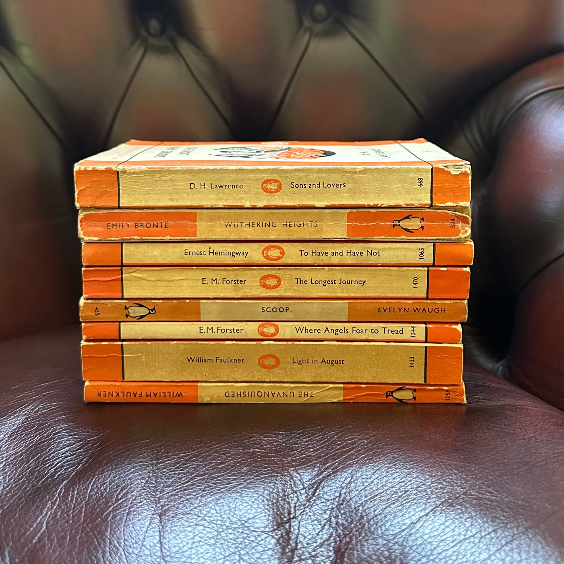 This is a set of eight Penguin softcover books with orange covers. These books, published in London, are highly collectable! Each measures 4.5” x 7”. The books are in varying conditions, from fair/good to great. The titles include: