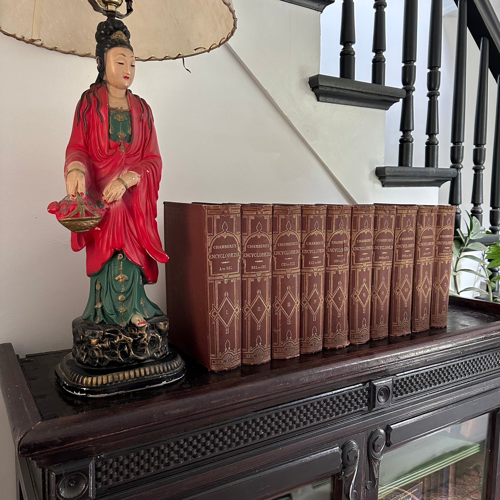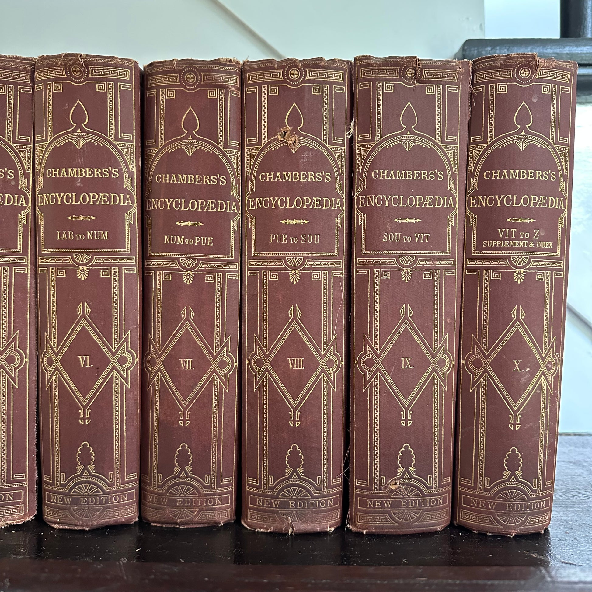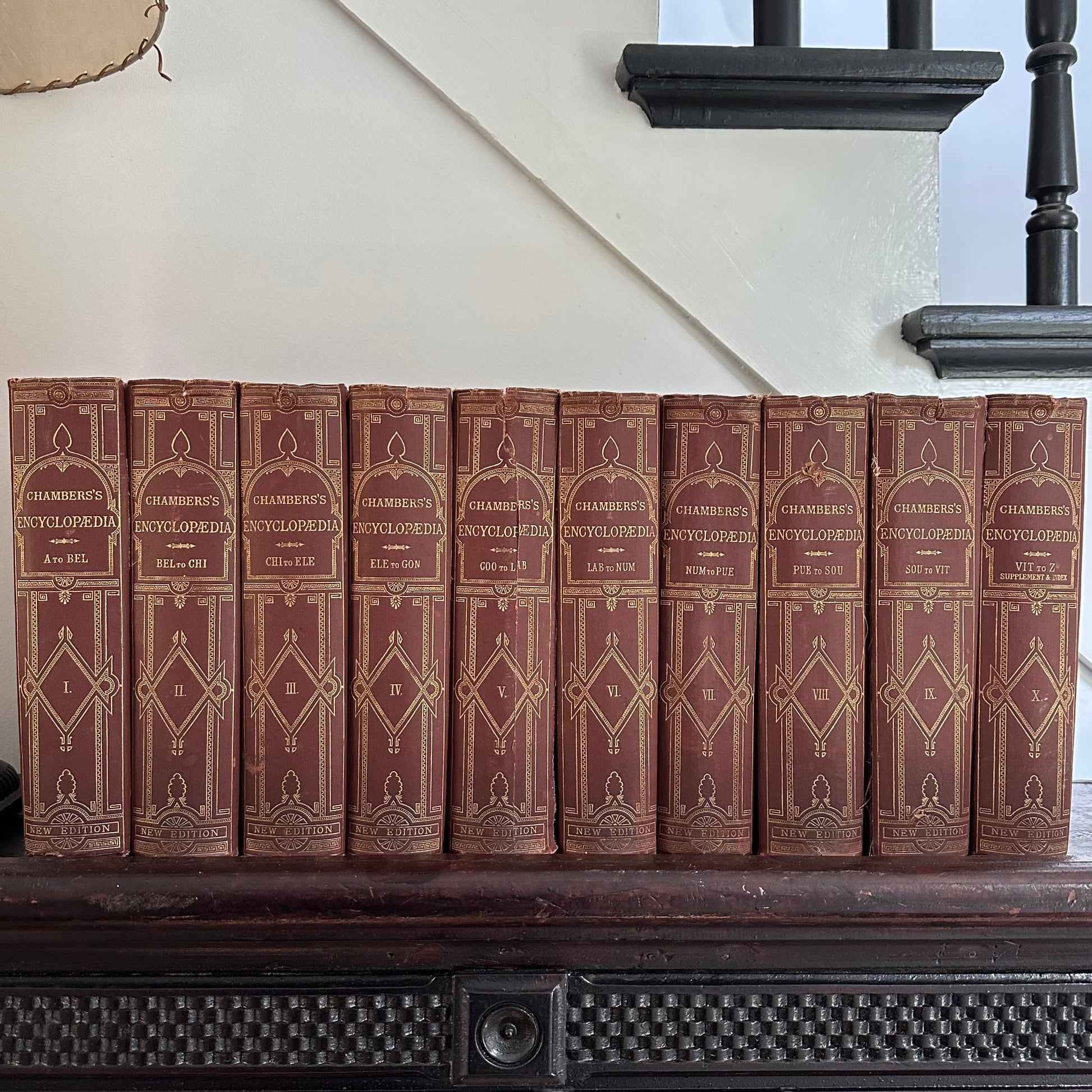 This is a rare, complete ten-volume encyclopedia set from 1877! It’s hard to believe these encyclopedias have remained together for 148 years! These encyclopedias are truly wonderful, with illustrations accompanying the entries, as well as colored maps of the major countries and regions of the world. Each volume measures 7.5” x 10.5” and contains 800-1,000 pages. The tenth volume has a supplemental section and an index. These encyclopedias are in good to great condition for their age. Some of the spines are brittle and show wear. The interior pages are in excellent condition. Use the set as part of your autumn home decor!