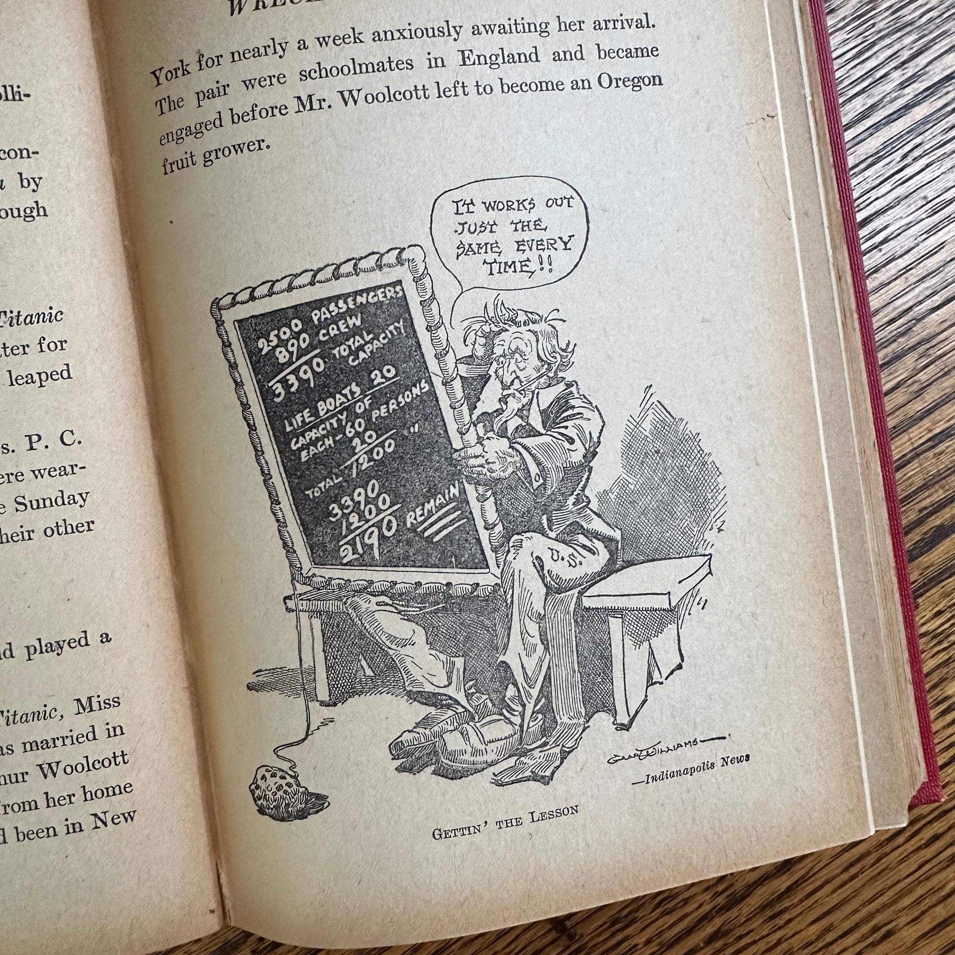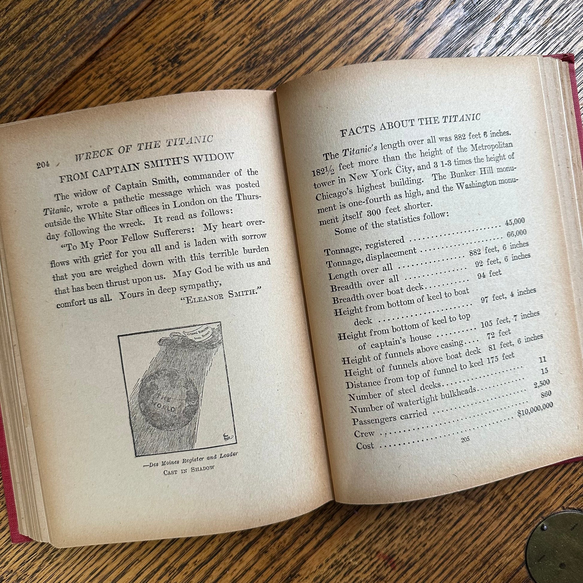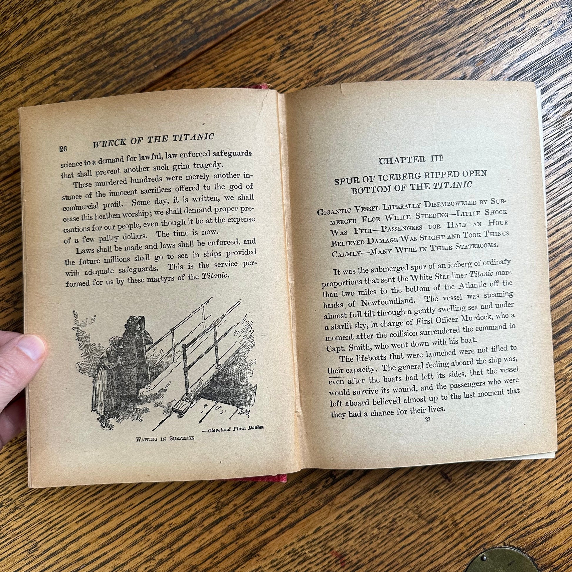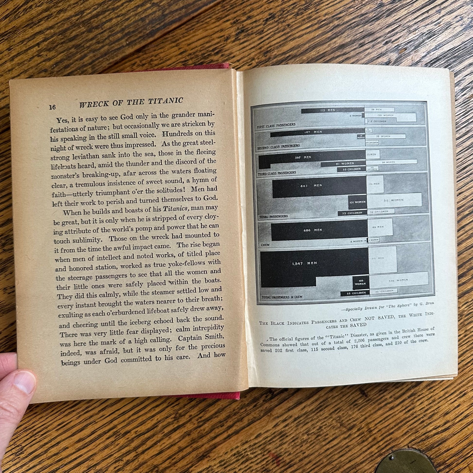 This is a great piece of memorabilia published the same year the Titanic sank!!! It is a graphic account of death and survival, illustrated in pictures and photographs. This book is in great condition, other than some yellowing of its pages. It would make a terrific gift for anyone who’s fascinated with this disaster It measures 6” x 8.25” and contains 320 pages, including a list of the dead.